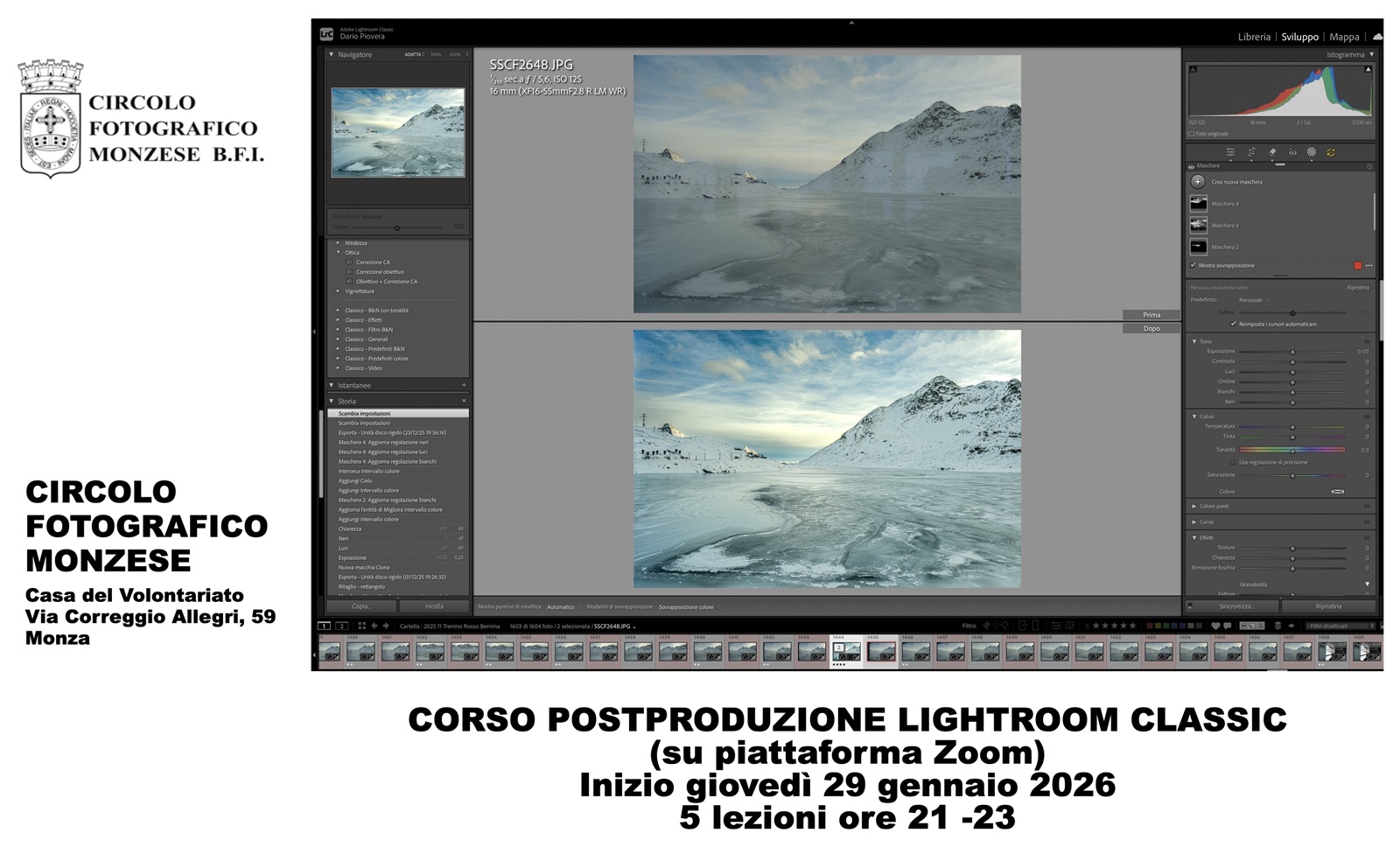Cinque appuntamenti per conoscere come organizzare al meglio il proprio archivio fotografico e affrontare i passaggi della corretta post produzione con un flusso di lavoro ottimizzato e snello per l’importazione delle foto, la catalogazione, la modifica e la generazione dei file per la stampa e l’utilizzo sui social. Il corso si terrà via piattaforma Zoom dal 23 ottobre al 20 novembre 2024 dalle ore 21,00 alle ore 23,00. Il costo è di € 80,00 oltre a € 60,00 (€ 30,00 per “under 30”) per i non soci per quota iscrizione al Circolo Fotografico Monzese valida anche per tutto il 2025.